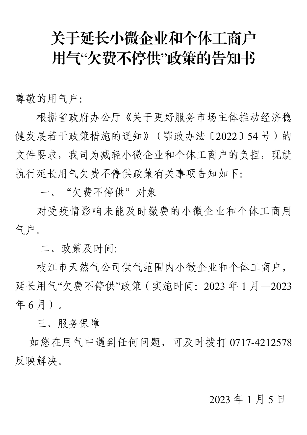 關(guān)于延長(zhǎng)小微企業(yè)和個(gè)體工商戶用氣“欠費(fèi)不停供”政策的告知書(shū)