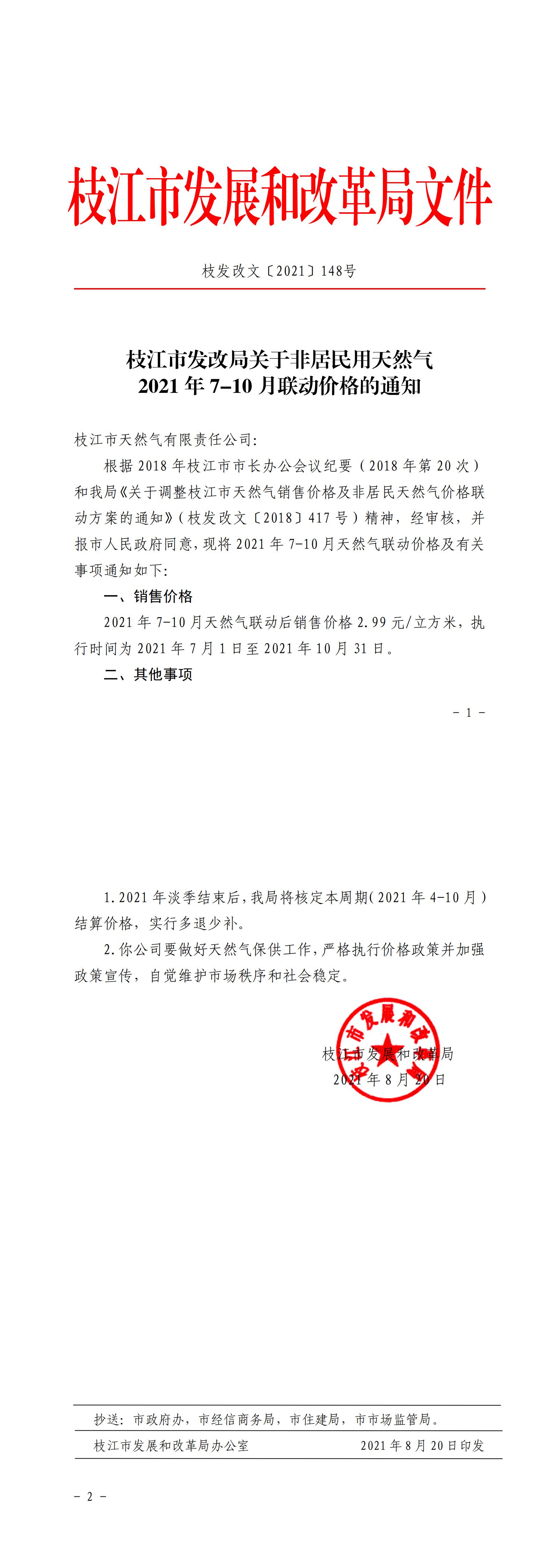 關(guān)于非居民用天然氣2021年7月——10月聯(lián)動(dòng)價(jià)格的通知