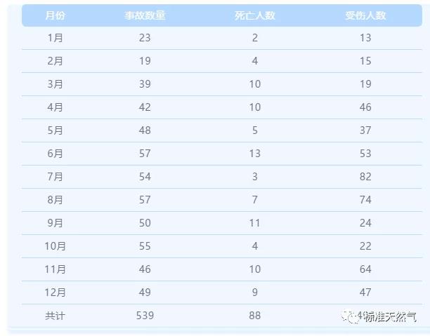 據(jù)博燃網(wǎng)平臺(tái)收錄統(tǒng)計(jì),2020年全年共計(jì)發(fā)生燃?xì)獍踩鹿?39起,共造成88人死亡,496人受傷。